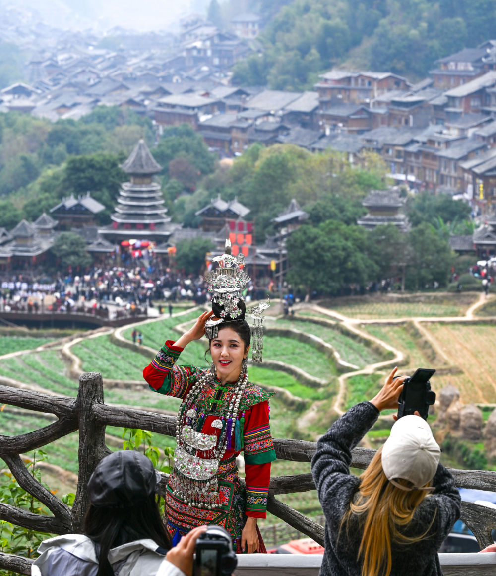 游客在貴州省黎平縣肇興侗寨觀景臺留影(2025年12月20日攝)。新華社記者 楊文斌 攝