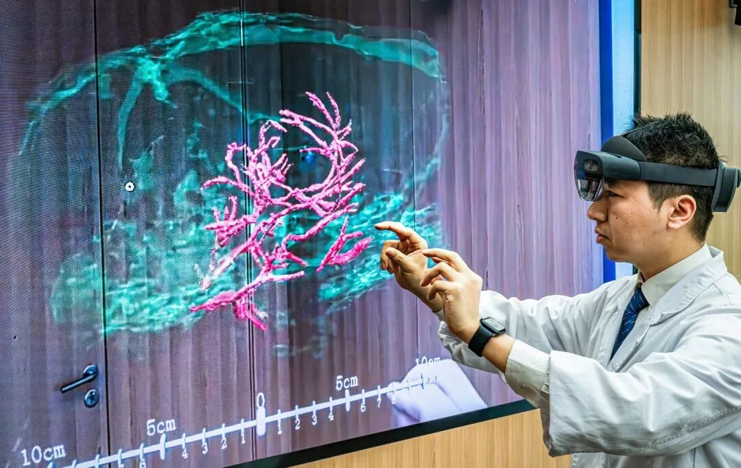 2026年2月26日,科研人員通過微米級腦機(jī)接口混合現(xiàn)實(shí),精準(zhǔn)呈現(xiàn)腦機(jī)接口與大鼠大腦主要血管和腦組織的空間位置關(guān)系。圖/新華社記者 肖藝九 攝