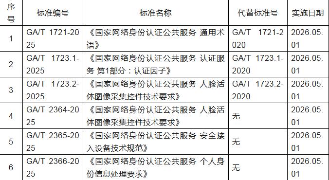 《國家網(wǎng)絡(luò)身份認證公共服務(wù)管理辦法》已于2025年5月23日發(fā)布,并于7月15日實施。為支撐法規(guī)的落地與實施,近日公安部發(fā)布了2025年第2號《中華人民共和國公安部公共安全行業(yè)標(biāo)準(zhǔn)公告》,國家網(wǎng)絡(luò)身份認證公共服務(wù)標(biāo)準(zhǔn)體系中6項公共安全行業(yè)標(biāo)準(zhǔn)正式發(fā)布,于2026年5月1日實施。標(biāo)準(zhǔn)具體內(nèi)容如下: