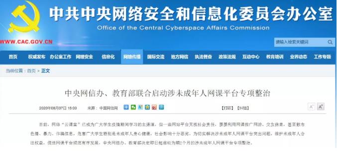 為貫徹落實(shí)中央部署要求,江蘇省委網(wǎng)信辦、省教育廳組織專題會(huì)議,認(rèn)真摸排屬地網(wǎng)站平臺(tái),深入推進(jìn)全省涉未成年人網(wǎng)課平臺(tái)專項(xiàng)整治工作。