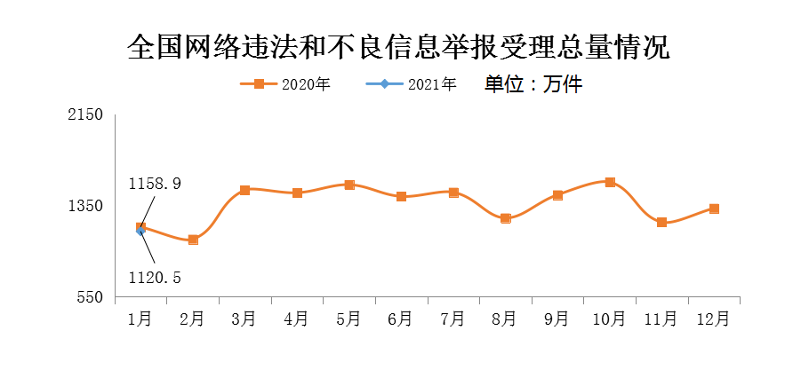 2021年1月,全國各級網(wǎng)絡(luò)舉報(bào)部門受理舉報(bào)1120.5萬件,環(huán)比下降15.2%、同比下降3.3%。其中,中央網(wǎng)信辦(國家互聯(lián)網(wǎng)信息辦公室)違法和不良信息舉報(bào)中心受理舉報(bào)17.6萬件,環(huán)比增長4.6%、同比增長72.0%;各地網(wǎng)信辦舉報(bào)部門受理舉報(bào)107.1萬件,環(huán)比下降16.0%、同比下降26.6%;全國主要網(wǎng)站受理舉報(bào)995.8萬件,環(huán)比下降15.5%,同比下降0.7%。