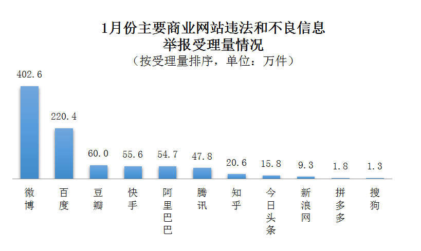 在全國主要網(wǎng)站受理的舉報(bào)中,微博、百度、豆瓣、快手、阿里巴巴、騰訊、知乎、今日頭條、新浪網(wǎng)、拼多多、搜狗等主要商業(yè)網(wǎng)站受理量占89.6%,達(dá)892.3萬件。