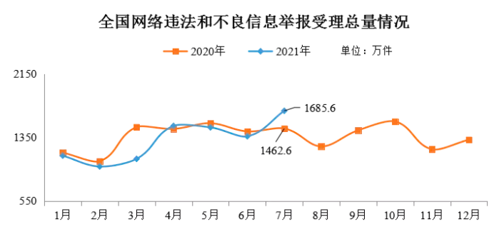 2021年7月,全國各級網絡舉報部門受理舉報1685.6萬件,環(huán)比增長23.5%、同比增長15.2%。其中,中央網信辦(國家互聯(lián)網信息辦公室)違法和不良信息舉報中心受理舉報31.4萬件,環(huán)比下降41.0%、同比增長82.4%;各地網信辦舉報部門受理舉報113.3萬件,環(huán)比增長17.9%、同比下降22.2%;全國主要網站受理舉報1540.9萬件,環(huán)比增長26.8%、同比增長18.6%。