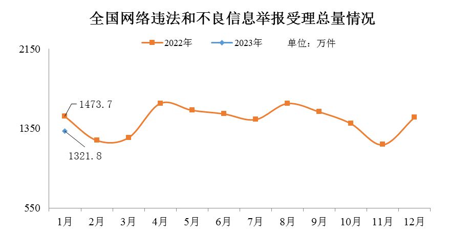 2023年1月,中央網(wǎng)信辦舉報中心指導(dǎo)全國各級網(wǎng)信舉報工作部門、主要網(wǎng)站平臺受理網(wǎng)民舉報色情、賭博、侵權(quán)、謠言等違法和不良信息1321.8萬件,環(huán)比下降9.6%、同比下降10.3%。其中,中央網(wǎng)信辦舉報中心受理舉報57.9萬件,環(huán)比下降13.7%、同比增長58.5%;各地網(wǎng)信舉報工作部門受理舉報66.6萬件,環(huán)比下降13.8%、同比下降32.1%;全國主要網(wǎng)站平臺受理舉報1197.4萬件,環(huán)比下降9.2%、同比下降10.6%。