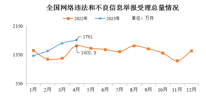 2023年4月,中央網(wǎng)信辦舉報(bào)中心指導(dǎo)全國(guó)各級(jí)網(wǎng)信舉報(bào)工作部門(mén)、主要網(wǎng)站平臺(tái)受理網(wǎng)民舉報(bào)色情、賭博、侵權(quán)、謠言等違法和不良信息1761萬(wàn)件,環(huán)比增長(zhǎng)5.4%、同比增長(zhǎng)9.9%。其中,中央網(wǎng)信辦舉報(bào)中心受理舉報(bào)74.2萬(wàn)件,環(huán)比增長(zhǎng)67.5%、同比增長(zhǎng)46.7%;各地網(wǎng)信舉報(bào)工作部門(mén)受理舉報(bào)49.7萬(wàn)件,環(huán)比下降32.8%、同比下降38.3%;全國(guó)主要網(wǎng)站平臺(tái)受理舉報(bào)1637.1萬(wàn)件,環(huán)比增長(zhǎng)5.5%、同比增長(zhǎng)11.2%。
