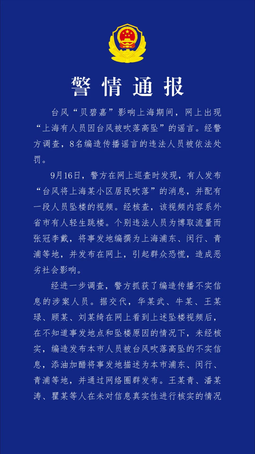 市公安局介紹,8名編造傳播“本市有人員因臺風(fēng)被吹落高墜”謠言的違法人員被依法查處?;ヂ?lián)網(wǎng)不是法外之地,市民群眾應(yīng)依法依規(guī)文明上網(wǎng),加強網(wǎng)絡(luò)信息來源甄別,不轉(zhuǎn)發(fā)未經(jīng)核實的信息,共同營造清朗有序網(wǎng)絡(luò)空間。對各類故意編造、傳播謠言的違法犯罪行為,公安機關(guān)將依法予以嚴(yán)厲打擊。詳見↓