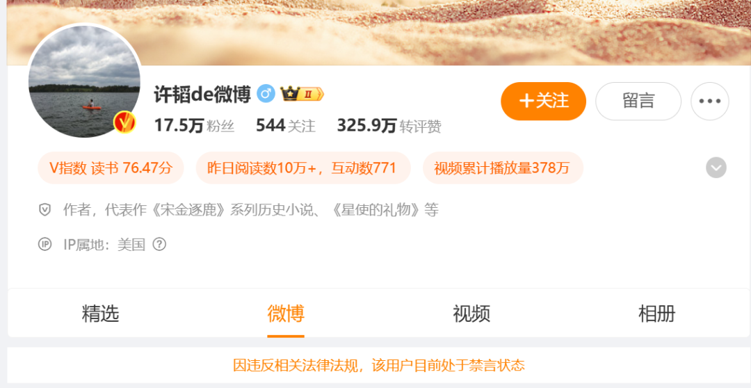 今天(22日)上午,記者查詢發(fā)現(xiàn),微博賬號(hào)“許韜de微博”下方顯示“因違反相關(guān)法律法規(guī),該用戶目前處于禁言狀態(tài)”。
